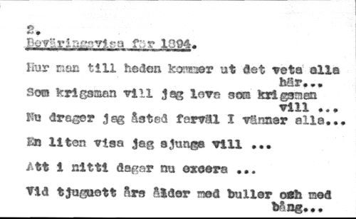 ** '• //// Itevyrin^vira f:.r 1894, //// Hur ciöc till heäen karasaer ut det veta alla //// hör.,. //// Sora krigsman vill jag lava som krigsman //// vill //// Eu dreger Jag åstad farvSl I värmer alla... //// En liten visa Jag sjunge vill ... //// Att i nltti dagar nu exeera ... //// ?id tjugoett års ålder med buller o*h med //// bång,. t