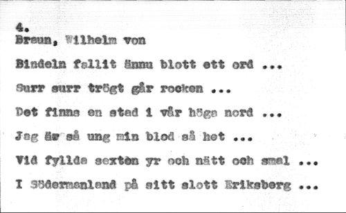 4. //// Bvffiffi, von //// Bindels fr11it gram blett ett ord ... snrr surr trögt gir rocken ... t>et flima en stod i rlr hSgs nord ... Jeg åe så ung nin blod si het ... //// ?id fyllda scxtdn yr och nätt och snsl I 3öderr5®aland pl sitt slott Eriksberg