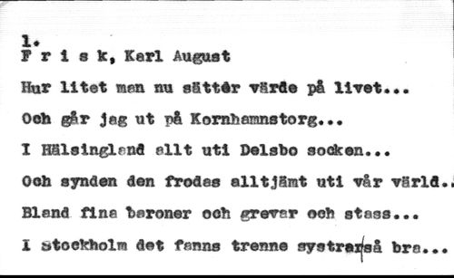 1. //// Frisk, Karl August //// Ifar litet raen nu s&ttér Tfirfle på livet.*. //// Oefc gSr Jag ut på Kornhemnstorg... //// I Haiglnglrn« ellt uti Delsbo sode en... //// Ooh synden den frodas alltjSrat uti vår vSrld.. //// Bland fina baroner ooh grevar ooh stass... I ötookholw det fanns trenne systrei^så bra,