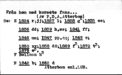 ?rån hem med korsets fans*.* //// (Av P.D.A.Atterbom) //// Se: B 1824 r,j.1;lQ27 \% 1888 g',1835 ee; 1836 dd; 183g h,ss; 1841 ff; //// 1840 ram; 1847 pp.qqj 1849 7,\ //// .850 XJ*,185Q dd;1869 ^«.1670 t3*, //// [men hv //// W 1842 bV 1868 d //// Itterbora enl.LUB.