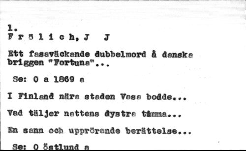 X. //// Frslioh, j j //// Ett fessräekende dubbelmord & danske brlggen ''Fortuna'',.. //// Se: 0 a 1869 a //// I Finland nära staden Vasa bodde,.• Vad täljer nattens dystre tårarna.., //// En sann och upprörande berättelse.,. Se: 0 8stlund a____________________