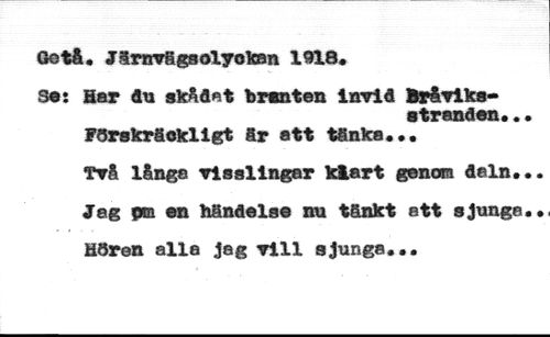 Gotå. Järnvägs olyckan 1918. //// 3«: Har du skådat branten invid Bråviks- //// 8tranden.. //// Förskräckligt är att tänka... //// Två långa visslingar klart genom deln. Jag pm en händelse nu tänkt att sjunga Hören alla jag vill sjunga...