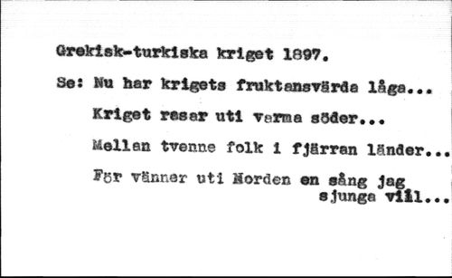 Grekisk-turkiska kriget 1897. //// Se: Nu har krigets fruktansvåråa låga.. //// Kriget reaar uti varna sSder... //// Mellan tvenne folk i fjfirran länder //// Fer vänner uti Horden en s&ng Jag //// sjunga vlil