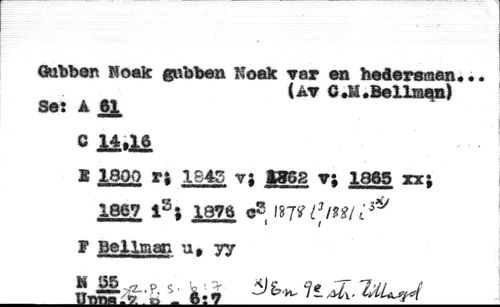 Gubben Noak gubben Noek Tar en hedersman. //// (¿v 0.Ä.Bellman) //// Se: A 61 //// CM //// * l&OQ ** 1S4S v; jggg t; 186g rx; //// 1867 Is J 1876 c'' 187 VI* Ml i3* //// F Bellman u# yy //// * JS&;£..P, s. W //// Ptwis:y..n m 6:7 //// m £» H» 7 - ¿t/i- lyiLsf ff