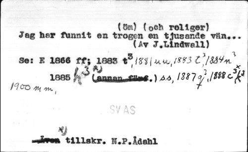 (5m) (och roliger) //// Jag har funnit en trogen en tjusande vän... //// (Av J,Llnäwall) //// Se: E 1866 ff; 1885 t® Wi\ t]/8åV*L ^ 1085 . ) A4, 13$ 7 *]/ \ ** //// I //// Cm / A r* //// o ¥ h6 //// * tillakr. N.P.Ädahl