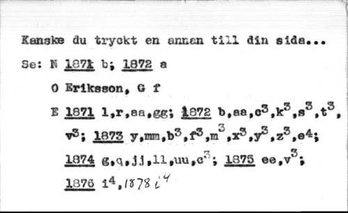 Kanske du tryckt en annen till din sida... Se: K 1071: bi 1972 a 0 Eriksson» G t //// E 1871 l,r,sa,gg; 1872 b,aa,c3,kS,s5,t 187g ypiara,b5tfs>!3r>x3fys,z3,e4 1974 g*q*jj 1875 ee,v^; //// i ona a 4 /•*¦''?<? ^
