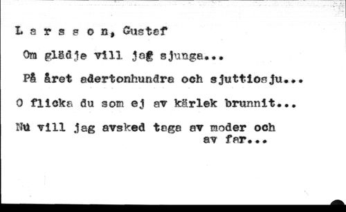 L s r s ? o b( Gustaf //// Ora glädje vill jag sjunga,,. //// På året edertonhundra och sjuttioaju //// 0 flicka du som ej av kärlek brunnit. //// IM vill jag avsked tega av moder och //// av far...