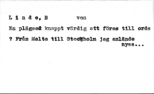 L 1 n d e, B von //// En plågsed knappt värdig stt föraa till ords //// ? Från Malta till Stoö^holm jag anlände //// nyss...