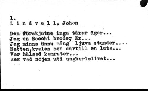 1, //// lindvall, Johan //// Den förskjutna inge tårer äger... //// Jeg en Becchi broäey är... //// Jeg minns ännu mång ljuve stunder Hatten,kvalen och därtill en lute. Ver hälsad kamrater... //// Aek ved nöjen uti ungkarlslivet...