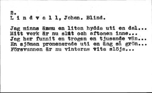 tr*M //// i n Ä v e 1 1, Johan. Blind. //// Jag minna ännu en liten hydda uti en dal. Mitt verk: är nu sl4tt och aftonen inne... Jag har funnit en trogen en tjusande vän. En sj öraen promenerade uti en äng så grön. Försvunnen är nu vinterns Vita slöja,..