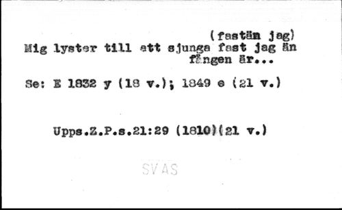 {faatän jag} //// Mig ly«tor till att sjunga fast Jag fin //// ffngen Sr*». //// Se*. B 1832 y (18 v.); 1049 e (21 v.} //// Upps.Z.P.S.21ï29 (1810)(21 ?.)