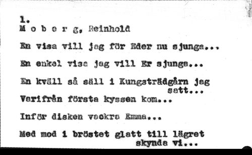 KH //// o b e r g, P.eiäholft //// En visa vill Jag för Eder nu sjunga. //// fin enkel vise jag vill sr sjungs... //// fin kväll så säll i Kungsträdgårn jsg //// satt... //// Varifrån första kyssen kon. • • //// Infar disken vackra finna.,. //// Med mod 1 bröstet glatt till lägret //// skynda vi,