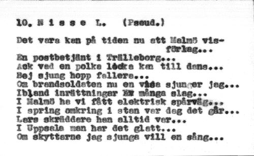 10, Um t* (Pseud,) //// Det tere tea på tides su ett Hains ele* //// fdrleg** * //// Ka postbetjänt t Trelleborg* • . //// Aek ved en polka ledra km till dans*«» »el »Jung hopp feilere* •• //// Os brandsoldaten nu en vtia ejun er Jag** Ibland InrSttatngar m aåags slag*,* //// 1 Malmö ha vi fått elektrisk spårtig* *# //// I spring osöcrlng i stan var dag Set gir** Lare skrdddere hen alltid var*** //// 1 Uppsala nan har det glatt. •• //// Om skytterns $m sjunga vill en sång***