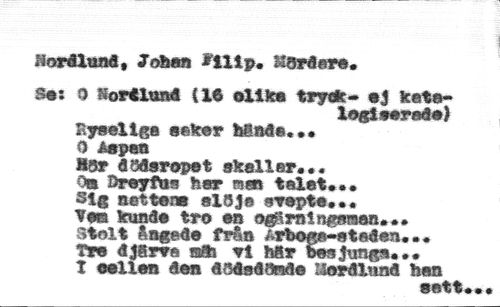 nordlund, Johan *tllp. Mördar«, //// Smi 9 Nordlund (16 olik« tryck- «j katalogiserad») //// Ryaeltga saker h&nde«.« //// 9 Aapan //// H8r dödsropet skallar«.. //// 9* Dreyftt?» fear ra« talet« •• //// 3ig nettona slöja arapta«.« //// ?«n kund* tro en og^rnl ngsraen,, • //// Stolt ångad« från Arboga-staden«*« //// Tre djgrra w8a vt hfir besjunga«.« t ««Ilen dan dadadöesde 'Mordlund feen //// «ett*
