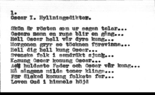 I* //// Osear î. Jfylliilngittlktar. //// Sk9n &t rösten mm ur asgan telar... Oseare mm m rase Mtr en g*ni§... Hell Osear hell rlr tyre kung... iforgonen gryr ee töeknen f^rsriann... Hell tig hell kung Oserr... oeentk* folk i sefströkt sjunk*** //// Konung Osear konung Osear**. //// A<| imítente Foter och Osear rir kssng* K& *?ngen» nilte toner kllngr.** //// För Ilsket konung folkets fer.•• //// //// Loren Ont i M arele höjt