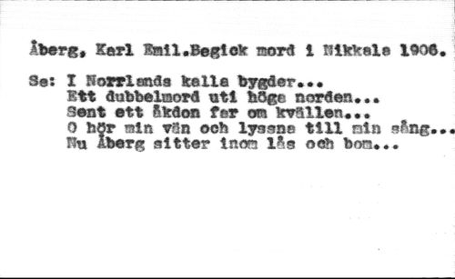 Ibers* Karl Smil.Begio* sord 1 SiWcala 1906. //// Sa: I fiorrlmds keile bygder.•• //// Ett dubbelmord uti böge norden... //// Sent ett åbdon fer tm Irrallen... //// 0 hör min ran och lyssne tili min sång.. Hu Aberg sitter inom lås och bon...