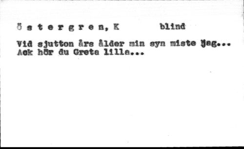 blind //// östergren, K //// Vid sjutton åra ålder min syn miste $ag. Aek hör du Greta lilla».•