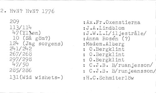 2. HvN? HvN? 1776 //// 209 //// 113/114 //// 47 (Ylen) //// 10 (Så göm?) //// 121+ (Jag sorgens) //// 241/242 //// 267/268 //// 297/298 //// 47/50 //// 285/286 //// 131(Wid wishets-) //// tAx.Fr.Oxenstierna :J.A.Lindblom :J.W.L.L/iljestråle/ :Anna Rosén (?) :Madem.Alberg //// 0.Bergklint //// 0.Bergklint //// 0.Bergklint //// C.J.B. B/ruanjesson / ////C.J.B. B/runjeansson / ////:H.C.Schmiterlöw