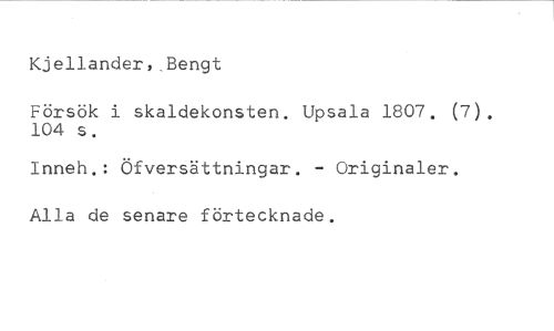 Kjellander,,Bengt //// Försök i skaldekonsten. Upsala 1807. (7). 104 s. //// Inneh.: Öfversättningar. - Originaler. Alla de senare förtecknade.