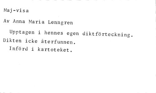 Maj-visa //// Av Anna Maria Lenngren //// Upptagen i hennes egen diktförteckning. //// Dikten icke återfunnen. Införd i kartoteket.