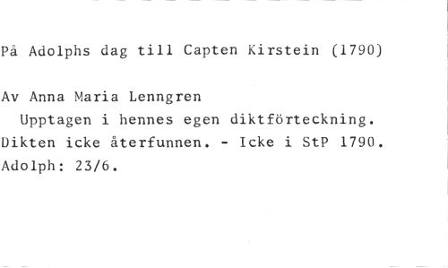 På Adolphs dag till Capten Kirstein (1790) //// Av Anna Maria Lenngren //// Upptagen i hennes egen diktförteckning. Dikten icke återfunnen. - Icke i StP 1790. Adolph: 23/6.