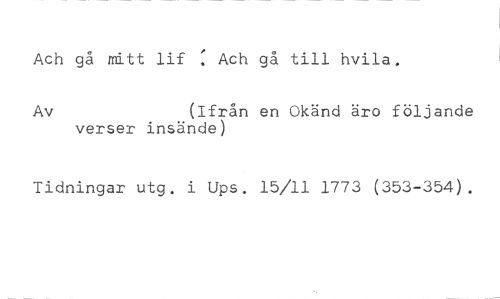 Ach gå mitt lif Ach gå till hvila. //// Av (Ifrån en Okänd äro följande //// verser insände) //// Tidningar utg. i Ups. 15/11 1773 (353-354).