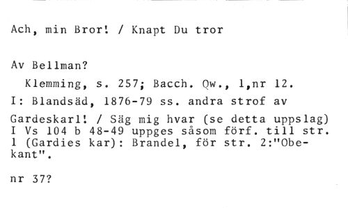 Ach, min Bror! / Knapt Du tror //// Av Bellman? //// Klemming, s. 257; Bacch. Ow., l,nr 12. I: Blandsäd, 1876-79 ss. andra strof av //// Gardeskarl: / Säg mig hvar (se detta uppslag) I Vs 104 b 48-49 uppges såsom förf. till str. 1 (Gardies kar): Brandel, för str. 2:"Obekant". //// nr 37?