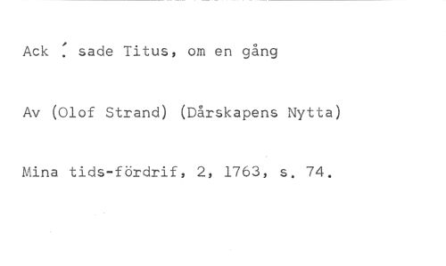 Ack : sade Titus, om en gång //// Av (Olof Strand) (Dårskapens Nytta) //// Mina tids-fördrif, 2, 1763, s. 74.