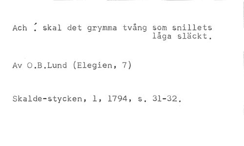 Ach : skal det grymma tvång som snillets //// låga släckt. //// Av O.B.Lund (Elegien, 7) //// Skalde-stycken, 1, 1794, s. 31-32.