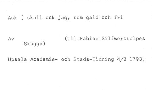 Ack : skall ock jag, som gald och fri //// Av (Til Fabian Silfwerstolpes //// Skugga) //// Upsala Academie- och Stads-Tidning 4/3 1793.