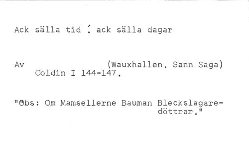 Ack sälla tid : ack sälla dagar //// Av (Wauxhallen. Sann Saga) //// Coldin 1144-147. //// "obs: Om Mamsellerne Bauman Bleckslagare- //// döttrar."