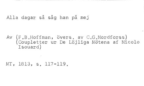 Alla dagar så såg han på mej //// Av (F.B.Hoffman, övers, av C.G.Nordforss) (Coupletter ur De Löjliga Mötena af Nicolo Isouard) //// MT, 1813, s. 117-119.