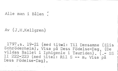 Alle man i Bålen //// Av (J.H.Kellgren) //// 1797,s. 19-21 (med titwl: Til Densamme (Elis Schröderheim), Visa på Dess Födelse-Dag. (De vildas Ballet i Iphigenie i Tauriden). (.- SS //// II 222-223 (med titel: Ril S m, Visa på //// Dess Födelse-Dag).
