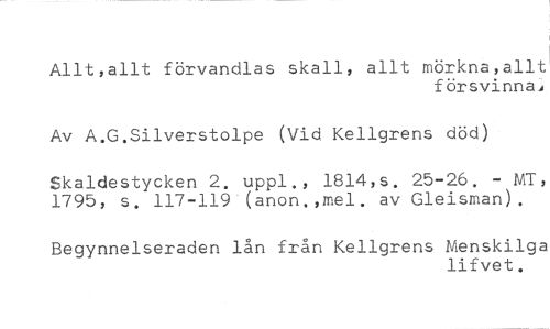 Allt,allt förvandlas skall, allt mörkna,allt //// försvinna4 //// Av A.G.Silverstolpe (Vid Kellgrens död) //// Skaldestycken 2. uppl., 1814,s. 25-26. - MT, 1795, s. 117-119 (anon.,mel. av Gleisman). //// Begynnelseraden lån från Kellgrens Menskilga //// lifvet.