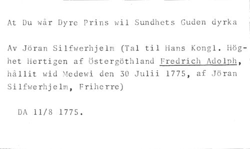 At Du wår Dyre Prins wil Sundhets Guden dyrka //// Av Jöran Silfwerhjelm (Tal til Hans Kongl. Höghet Hertigen af Östergöthland Fredrich Adolph, ' hållit wid Medewi den 30 Julii 1775, af Jöran Silfwerhjelm, Friherre) //// DA 11/8 1775.