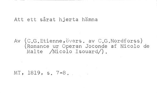 Att ett sårat hjerta hämna //// Av C.G.Etienne,övers. av C.G.Nordforss) Romance ur Operan Jöconde af Nicolo de Malte /Nicolo Isouard/). //// MT, 1819, s. 7-8.