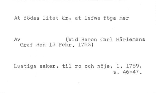 At födas litet är, at lefwa föga mer //// Av Nid Baron Carl Hårlemans //// Graf den 13 Febr. 1753) //// Lustiga saker, til ro och nöje, 1, 1759, //// s. 46-47.