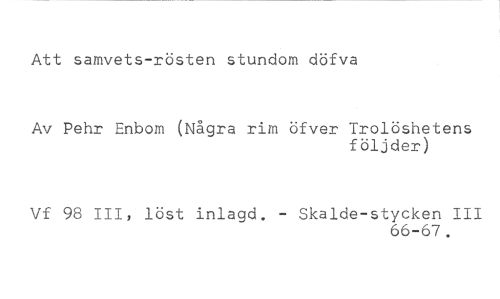 Att samvets-rösten stundom döfva //// Av Pehr Enbom (Några rim öfver Trolöshetens //// följder) //// Vf 98 III, löst inlagd. - Skalde-stycken III //// 66-67.