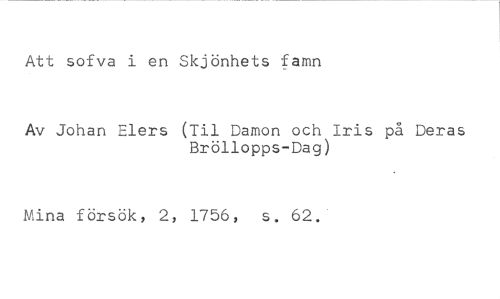 Att sofva i en Skjönhets famn //// Av Johan Elers (Til Damon och Iris på Deras Bröllopps-Dag) //// Mina försök, 2, 1756, s. 62.