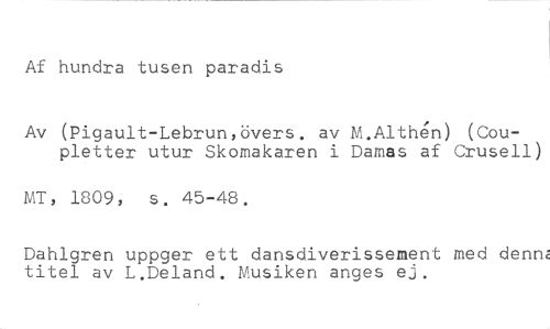 Af hundra tusen paradis //// Av (Pigault-Lebrun,övers. av M.Althen) (Coupletter utur Skomakaren i Darnas af Crusell) //// MT, 1809, s. 45-48. //// Dahlgren uppger ett dansdiverissement med denne titel av L.Deland. Musiken anges ej.