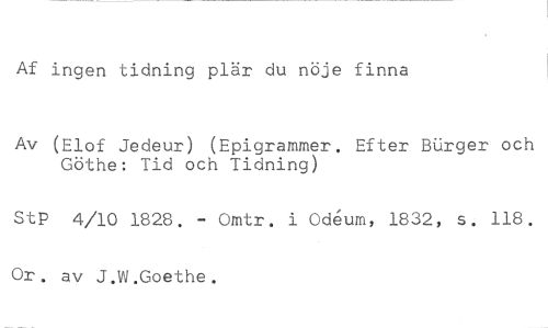 Af ingen tidning plär du nöje finna //// Av (Elof Jedeur) (Epigrameter. Efter Burger och Göthe: Tid och Tidning) //// StP 4/10 1828. - Omtr. i Odeum, 1832, s. 118. //// Or. av J.W.Goethe.