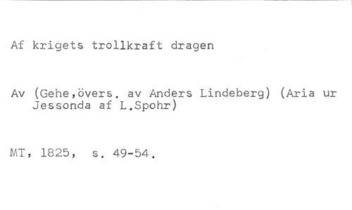 Af krigets trollkraft dragen //// Av (Gehe,övers. av Anders Lindeberg) (Aria ur Jessonda af L.Spohr) //// NIT, 1825, s, 49-54.