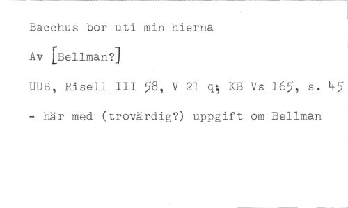 Bacchus bor uti min hierna //// Av [Bellman?] //// UUB, Risell III 58, V 21 q; K3 Vs 165, s. 45 - här med (trovärdig?) uppgift om Bellman