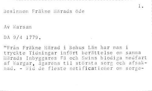 1. //// Besinnom Fräkne Härads öde //// Av Warsam //// DA 9/4 1779. //// "Från Fräkne Härad i Bohus Län har man i tryckte Tidningar infört berättelse om samma Härads Inbyggares Fä och Swins blodiga medfart af Wargar, ägarena til största sorg och afsaknad. - Wid de fleste notificationer om sorge-