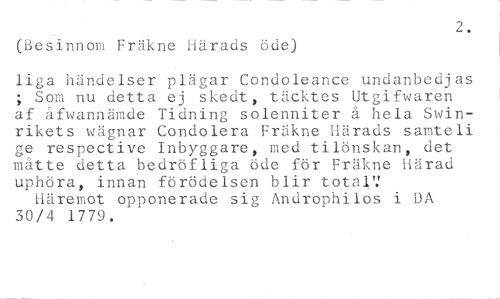 2. //// (Besinnom Fräkne Härads öde) //// liga händelser plägar Condoleance undanbedjas ; Som nu detta ej skedt, täcktes Utgifwaren af åfwannämde Tidning solenniter å hela Swinrikets wägnar Condolera Fräkne Härads samteli ge respective Inbyggare, med tilönskan, det måtte detta bedröfliga öde för Fräkne Härad uphöra, innan förödelsen blir total': //// Häremot opponerade sig Androphilos i DA 30/4 1779.