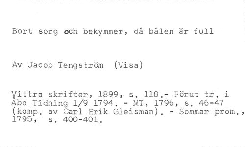 Bort sorg och bekymmer, då bålen är full //// Av Jacob Tengström (Visa) //// vittra skrifter, 1899, s. 118.- Förut tr. i Abo Tidning 1/9 1794. - MT, 1796, s. 46-47 (komp, av Carl Erik Gleisman). - Sommar prom., 1795, s. 400-401.