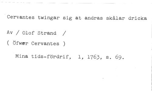Cervantes twingar sig at andras skålar dricka //// Av / Olof Strand / ( öfwer Cervantes ) //// Mina tids-fördrif, 1, 1763, s. 69.