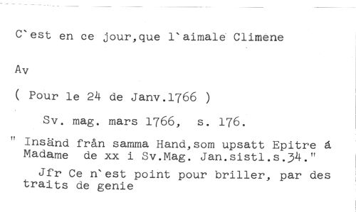 C'est en ce jour,que 1'aimale Climene //// Av //// ( Pour le 24 de Janv.1766 ) //// Sv. mag. mars 1766, s. 176. //// ft Insänd från samma Hand, som upsatt Epitre å Madame de xx i Sv.Mag. Jan.sistl.s.34." //// Jfr Ce n'est point pour briller, par des traits de genie