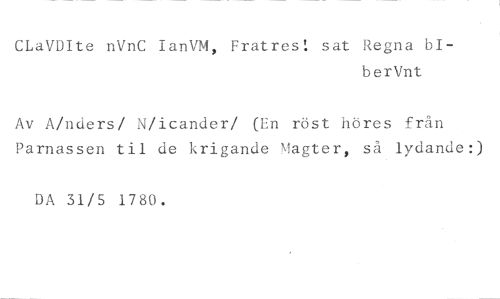 CLaVDIte nVnC IanVM, Fratrest sat Regna bI- //// berVnt //// Av A/nders/ N/icander/ (En röst höres från Parnassen til de krigande Magter, så lydande:) //// DA 31/5 1780.