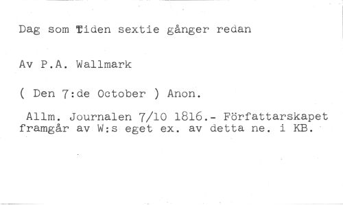 Dag som Tiden sextie gånger redan //// Av P.A. Wallmark //// ( Den 7:de October ) Anon. //// Allm. Journalen 7/10 1816.- Författarskapet framgår av W:s eget ex. av detta ne. i KB.